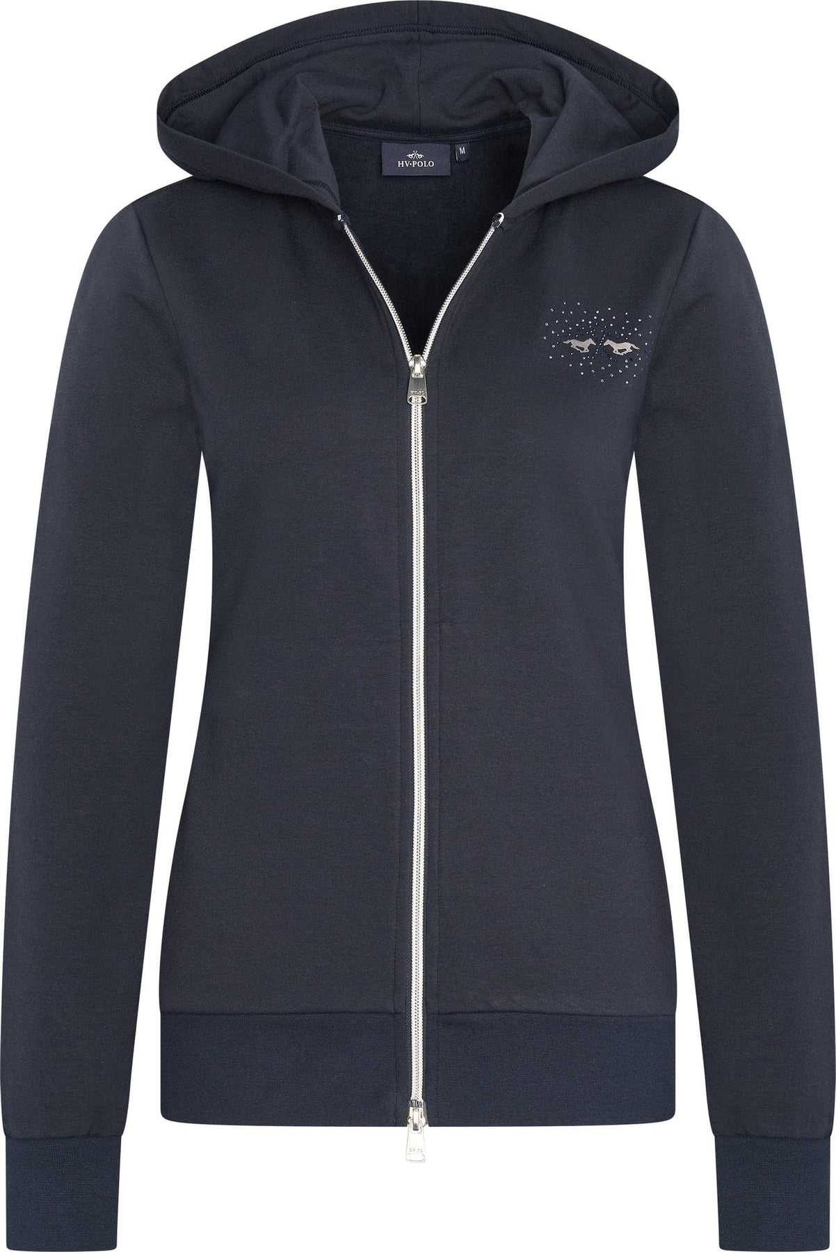 The HV Polo Classic Ladies Full Zip Hoodie combines refined equestrian style with everyday comfort. Crafted from soft cotton sweat terry, this piece delivers warmth without compromise on sophistication. The chest features an elegant horse logo embellished with rhinestones—a signature detail that celebrates your passion for riding. The two-way full front zipper offers versatile temperature control and fit adjustment, whilst ribbed waistband and cuffs ensure a secure, tailored silhouette that retains heat effectively. An essential layer for the discerning horsewoman seeking both performance and polish.